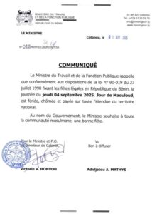Par communiqué en date du 1er septembre dernier, le ministre du Travail et de la Fonction publique informe que, conformément aux dispositions de la loi n° 90-019 du 27 juillet 1990 fixant les fêtes légales en République du Bénin, la journée du jeudi 4 septembre 2025, marquant la célébration du Maouloud, sera fériée, chômée et payée sur toute l’étendue du territoire national.