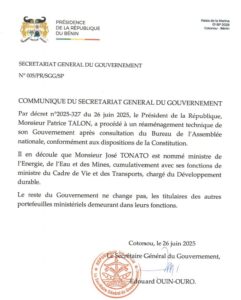 Comme annoncé il y a quelques instant, le processus de remplacement enclenché par le bureau de l’Assemblée nationale vient d’aboutir. A travers un communiqué en date de ce jeudi 26 juin 2025, le Secrétaire général du gouvernement béninois informe du remaniement ministériel technique effectué.