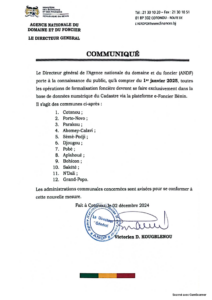 Selon l’agence nationale du domaine et du foncier (ANDF), les opérations de formalisation foncière se feront exclusivement dans la base des données numériques du cadastre via plateforme e-foncier Bénin à compter du 1er janvier 2025.