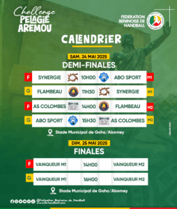 La ville royale d’Abomey accueillera les 24 et 25 mai 2025 la première édition du Challenge Pélagie Aremou, un tournoi de lancement de saison entièrement dédié aux équipes cadettes, dans la dynamique de développement du handball à la base. Ce challenge vise à promouvoir les jeunes talents au centre du pays et à leur offrir une plateforme d’expression en début de saison.