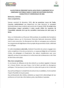 Conformément aux dispositions du Code électoral, la Commission Électorale Nationale Autonome (CENA) a officiellement lancé ce vendredi 26 décembre 2025, la campagne pour les scrutins couplés du 11 janvier 2026. Dans son allocution solennelle marquant l’ouverture de la campagne, Sacca Lafia, président de la CENA a appelé l’ensemble des acteurs politiques à faire de cette campagne un cadre de débat d’idées, de pédagogie citoyenne et de promotion des valeurs républicaines.