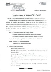 A travers un communiqué en date de ce jeudi 20 mars 2025, le Chef d’État-major Général des Forces armées béninoises, Fructueux Gbaguidi informe qu’il sera organisé un concours de recrutement spécial sur titre de cent (100) personnels militaires sous-officiers spécialisés en pilotage de drone et pour l’Armée de l’air, pour le compte de l’année 2025.