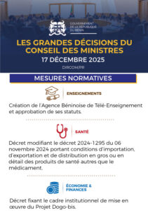 Home Actualités Conseil des ministres au Bénin : les grandes lignes de ce mercredi... ActualitésSociété Conseil des ministres au Bénin : les grandes lignes de ce mercredi 17 décembre By Jérémie Yenou - 17 décembre 2025 371 0 FacebookTwitterPinterestWhatsApp Le Conseil des ministres s’est tenu ce mercredi 17 décembre 2025 sous la présidence de Patrice Talon. Voici ci-dessous, les décisions prises.