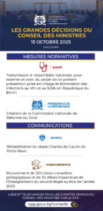 Home Actualités Conseil des ministres : les grandes décisions de ce 15 octobre ActualitésSociété Conseil des ministres : les grandes décisions de ce 15 octobre By Jérémie Yenou - 15 octobre 2025 575 0 FacebookTwitterPinterestWhatsApp Voici ci-dessous, les grandes décisions prises en conseil des ministres de ce mercredi 15 octobre 2025.