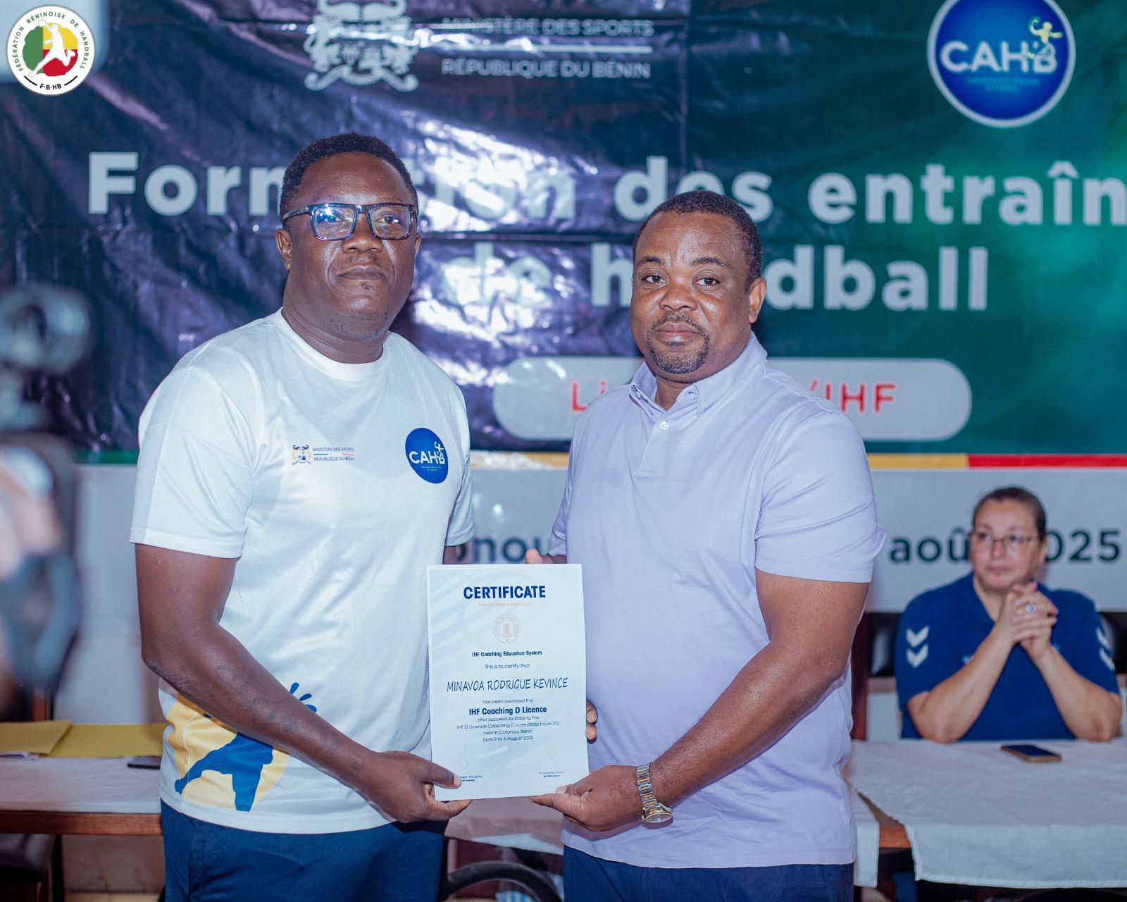 Du 2 au 6 août 2025, Cotonou a abrité une session de formation pour l’obtention de la Licence D/IHF, fruit d’une collaboration entre la Fédération Internationale de Handball (IHF), la Confédération Africaine de Handball, le Ministère des Sports et la Fédération Béninoise de Handball (FBHB). Au terme de l’évaluation finale, 27 participants ont décroché la précieuse Licence D/IHF, soit un taux de réussite de 66 %, preuve de l’assiduité et du sérieux des stagiaires. A travers cette session, le handball béninois vient de franchir un nouveau palier dans sa marche vers la professionnalisation.