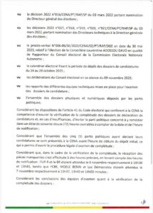 La CENA a écarté le parti de l’opposition Les Démocrates (LD) et celui de la mouvance, le Mouvement des élites engagées pour l’émancipation du Bénin (MOELE-Bénin) de la compétition électorale. Selon la CENA, « le parti Les Démocrates a présenté matériellement des pièces », mais « sur les 473 pièces attendues au moment de la complétude, 353 ont été effectivement déposées, laissant apparaître une différence de 120 pièces manquantes ».