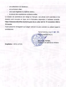 Les encadreurs culturels ont pour missions essentielles de former les apprenants dans les établissements secondaires suivant le programme de formation, et de contribuer à la détection et à la promotion des meilleurs talents. Cet appel à candidature est pour le compte des Communes de Porto-Novo, d’Abomey-Calavi et de Parakou.