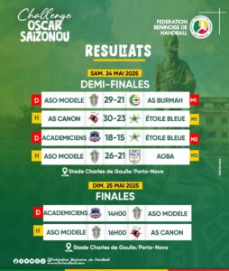Initié dans le cadre du lancement officiel de la saison de handball dans la zone Sud-Est du Bénin, le tournoi Challenge Oscar Saïzonou, a effectivement lieu ce samedi 24 mai 2025 au stade Charles de Gaulle de Porto-Novo. Ayant réuni 04 clubs féminins et 04 clubs masculins, voici ci-dessous, les résultats des demi-finales et l’affiche des équipes finalistes qui s’opposeront ce dimanche 25 mai.