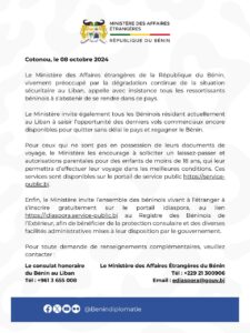 Compte tenu de la dégradation continue de la situation sécuritaire au Liban, le gouvernement béninois à travers le ministère des affaires étrangères invite tous les ressortissants béninois à quitter le Liban le plus tôt possible.