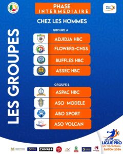 Chez les hommes, les huit équipes qualifiées pour la phase intermédiaire sont réparties en deux poules. C’est donc au sein de deux groupes (A et B) que va se disputer la phase intermédiaire de la Moov Africa Ligue Pro 2024 en Hommes.