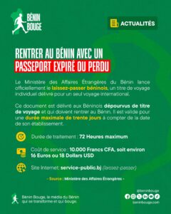 Un laissez-passer spécial pour le retour au bercail des Béninois de la diaspora. Selon le ministère, le laissez-passer est un titre de voyage individuel délivré pour un seul voyage international, aux Béninois dépourvus de titre de voyage et qui doivent rentrer au Bénin. Ce titre de voyage est valide pour une durée maximale de trente jours à compter de la date de son établissement. Il est essentiellement délivré pour des cas d’urgence et doit être remis au contrôle de l’immigration lors de l’entrée sur le territoire béninois.