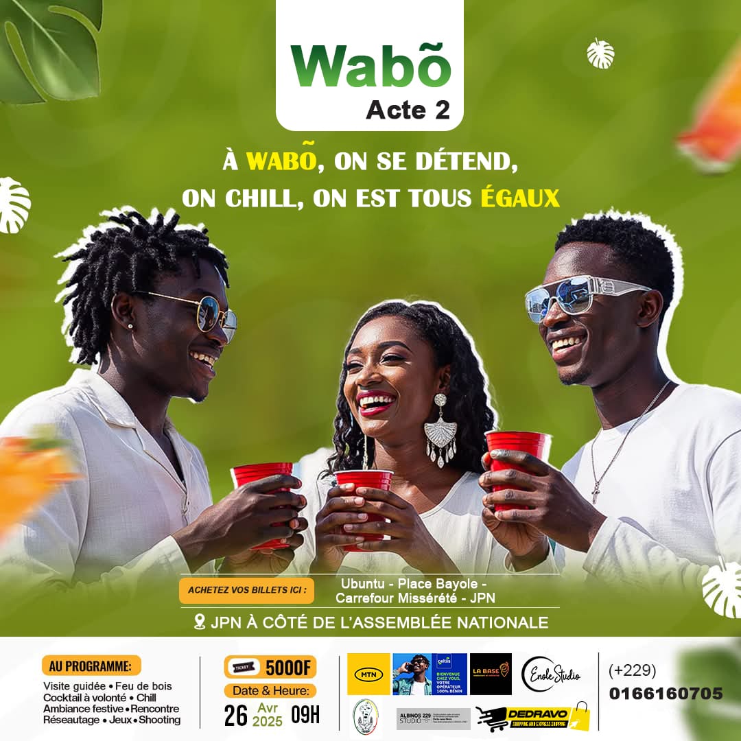 Les amateurs de détente, de bonne cuisine et d’ambiance conviviale ont rendez-vous ce samedi 26 avril pour le Brunch Wabõ Acte 2, l’événement récréatif le plus attendu à Porto-Novo ce weekend. La capitale béninoise s’apprête à vibrer au rythme de cette rencontre festive prévue au JPN (Jardin des Plantes et de la Nature), en face de l’Assemblée nationale, dès 9h du matin.