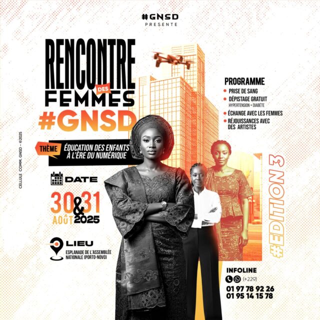 La Fondation GNSD organise la 3ème édition de la “Rencontre des Femmes GNSD” autour du thème “ Éducation des Enfants à l’Ère du Numérique”. L’événement tant attendu, aura lieu les 30 et 31 août 2025 sur l’Esplanade de l’Assemblée nationale à Porto-Novo. A cet effet, la Fondation GNSD invite les femmes de la ville capitale et des environs à prendre part aux différentes activités prévues pour cette célébration de la gent féminine, notamment la sensibilisation, l’éveil de conscience et le dialogue sur l’éducation des enfants à cette époque ou le monde est en plein essor avec la technologie.