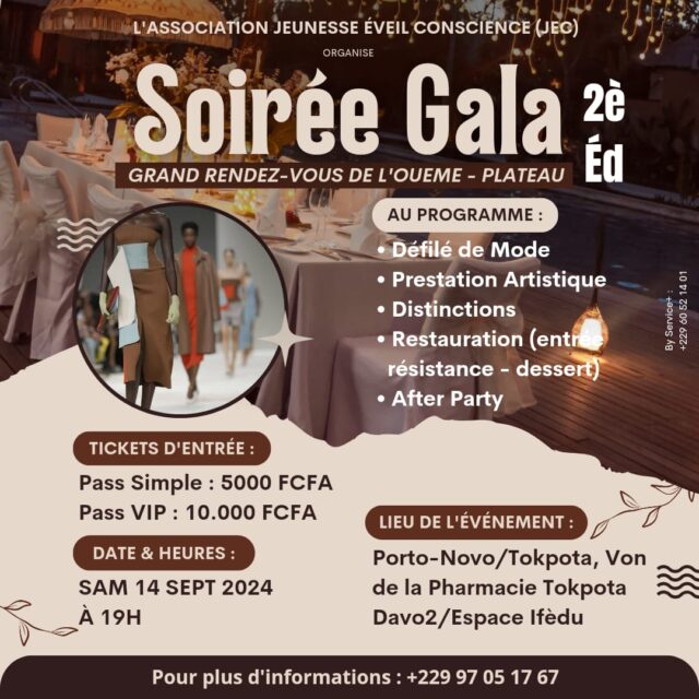 La ville capitale va une fois encore briller de mille feux le week-end prochain. En effet, l’édition 2 de la plus grande Soirée Gala, de Défilé de Mode et de Prestations Artistiques, organisée par l’Association Jeunesse Éveil (JEC), aura lieu le samedi 14 septembre prochain à l’Espace IFÈDU de Porto-Novo à partir de 19H.