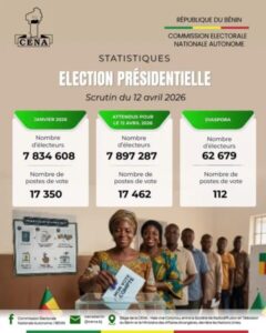 À deux semaines du premier tour de l’élection présidentielle prévu le 12 avril 2026, la Commission électorale nationale autonome (CENA) a annoncé les statistiques officielles du scrutin. Selon les données consolidées par l’Agence Nationale d’Identification des Personnes (ANIP) et transmises à la CENA, le corps électoral a franchi la barre symbolique des 7,8 millions d’inscrits (précisément autour de 7 834 608 lors du scrutin législatif de janvier dernier).