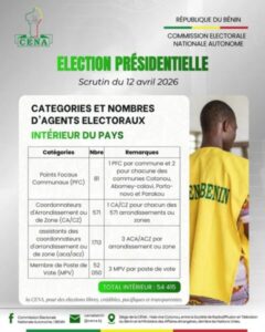 Pour garantir la transparence et le bon déroulement du scrutin, un total de 54 415 agents électoraux sera mobilisé à l’intérieur du pays. Ce personnel se répartit comme suit : 81 points focaux communaux (PFC), 571 coordonnateurs d’arrondissement ou de zone (CA/CZ),1 713 assistants des coordonnateurs (ACA/ACZ),52 050 membres de postes de vote (MPV).