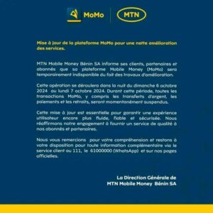 Les transferts d’argent, les paiements et les retraits, seront momentanément suspendus en fin de semaine. « MTN Mobile Money Bénin SA informe ses clients, partenaires et abonnés que sa plateforme Mobile Money (MoMo) sera temporairement indisponible du fait des travaux d’amélioration. Cette opération se déroulera dans la nuit du dimanche 6 octobre 2024 au lundi 7 octobre 2024. Durant cette période, toutes les transactions MoMo, y compris les transferts d’argent, les paiements et les retraits, seront momentanément suspendus », indique le communiqué.