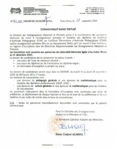 Le Ministre des Enseignements Maternel et Primaire, Salimane Karimou informe le grand public de l’ouverture du registre d’inscription pour le test de sélection des Aspirants aux Métiers d’Enseignant (AME).