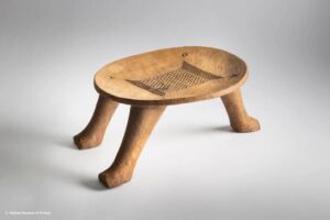 Pour rappel, le Kataklè est un siège royal du royaume de Danxomè. Modeste par son apparence mais d’une signification lourde et très profonde, il est utilisé lors des rituels princiers de la cour royale. Il incarne à la fois l’élégance, la sobriété et la modernité des expressions artistiques traditionnelles. Il est fabriqué en bois massif et se caractérise par sa forme basse, sans dossier, reposant sur trois pieds trapus.