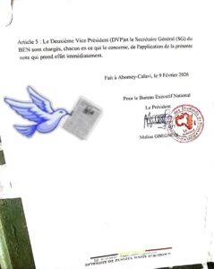 D’après une note de service signée le lundi 9 février 2026 par le Bureau Exécutif National de l’UNEB, cette décision fait suite à plusieurs plaintes notamment, le non-respect des directives, des préjudices à la cohésion et aux intérêts de l’association étudiante.