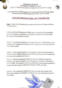 Le média estudiantin Le Révélateur de l’Université d’Abomey-Calavi (UAC) a été officiellement suspendu ce mardi 10 février 2026 par l’Union Nationale des Étudiants du Bénin (UNEB).